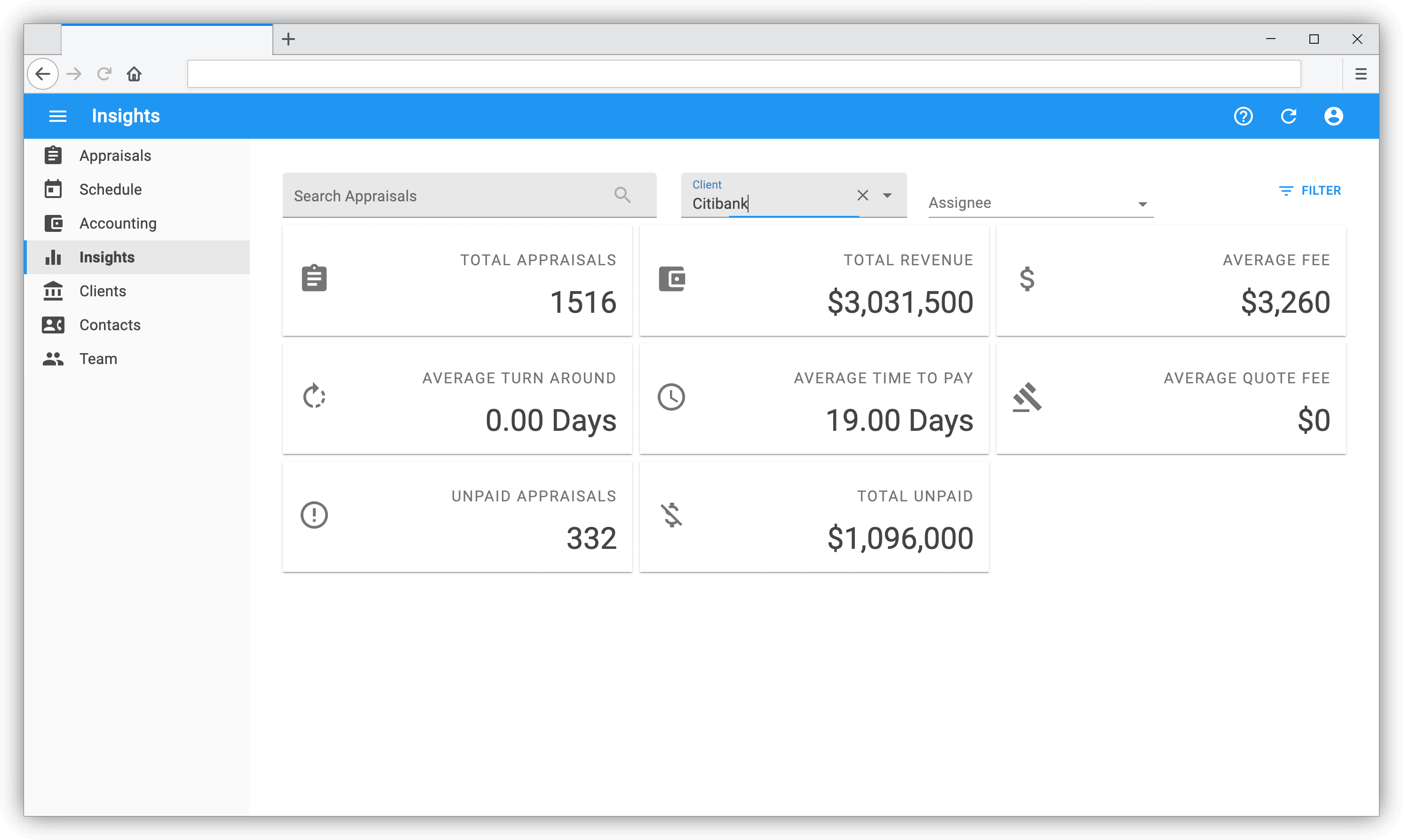 Key metrics like turn times, average fees, and more are automatically calculated by Appraisal Inbox - helping you make well informed decisions.