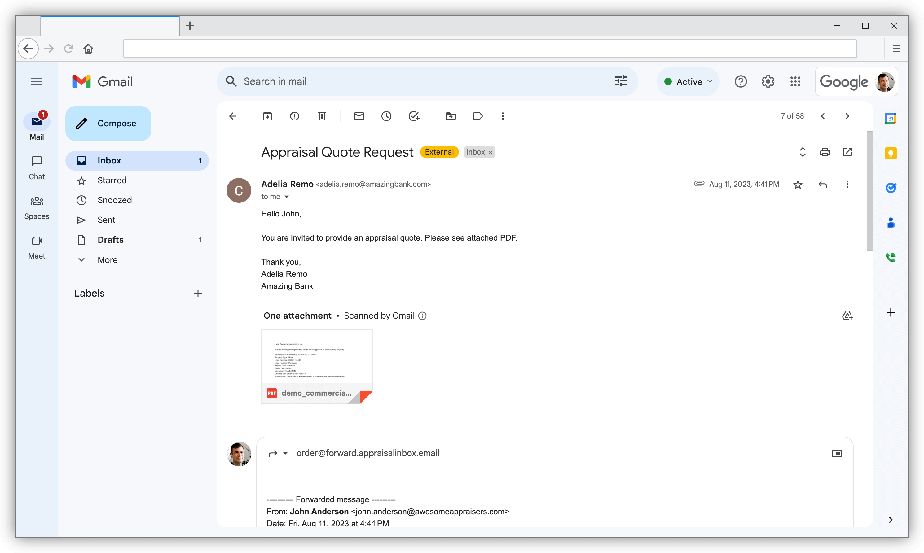 Automatically add appraisal orders into your Appraisal "Inbox" by simply auto-forwarding your AMC, lender, and client request and quote emails.